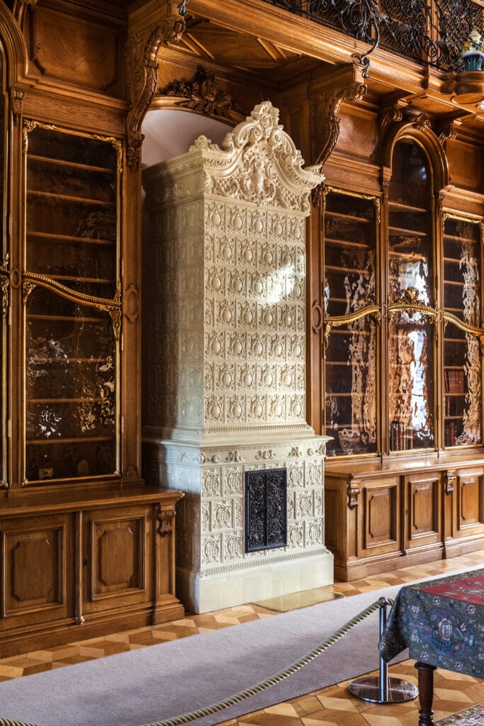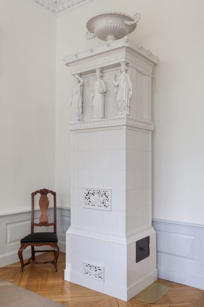 Eighteen stoves have returned to their rightful place, with four fully conserved and fourteen reconstructed based on historical documentation. Among them, the grandest stove from the Neo-Rococo library stands out, designed by architect Zygmunt Hendel in 1894.