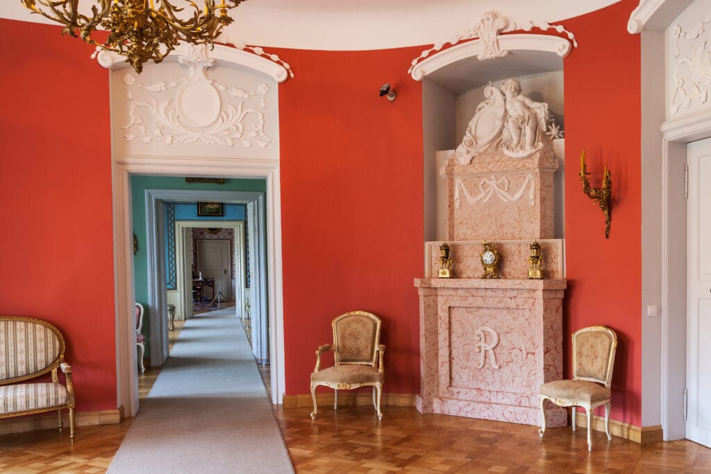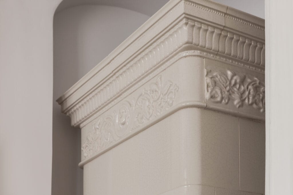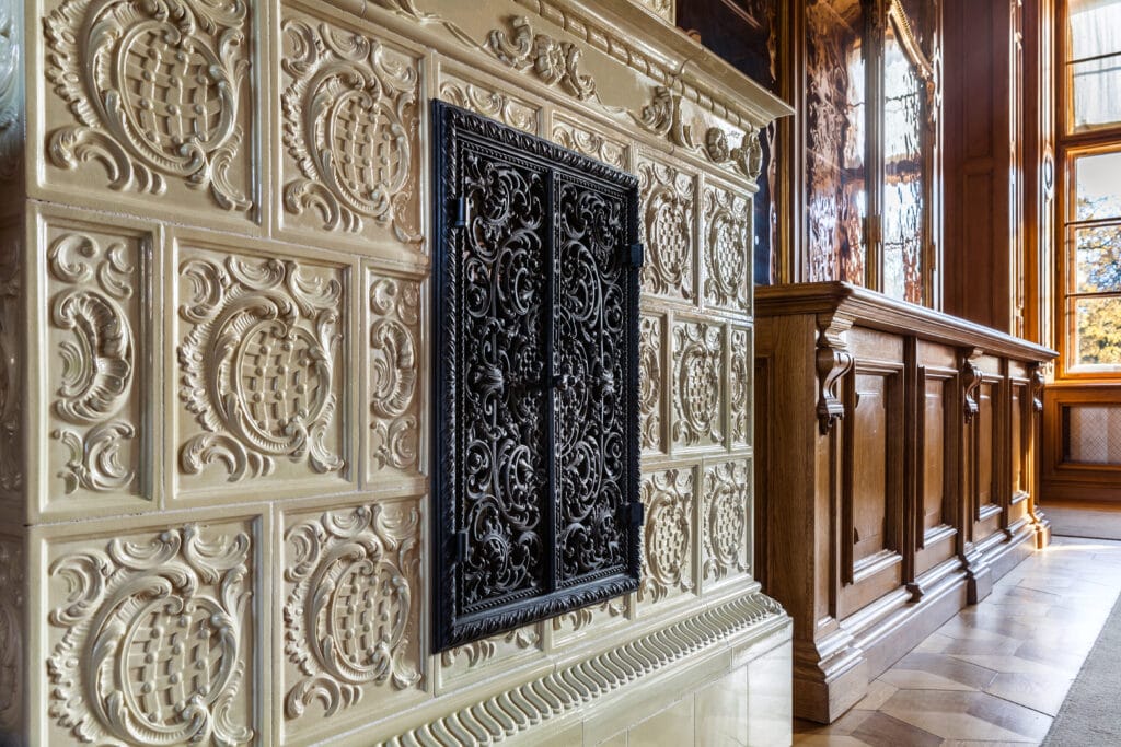 Thanks to our craftsmanship at Kaflarnia Karny the parent brand of Królik, the iconic tiled stoves of Rogalin have been meticulously reconstructed. Each stove has been carefully restored using archival photographs and original tiles, playing a crucial role in shaping the palace’s unique atmosphere. The preserved original tiles were placed after conservation in the form of so-called ‘witnesses’ in the stove bodies. However, only those in the know can find them, which speaks to the high quality of the reconstruction.